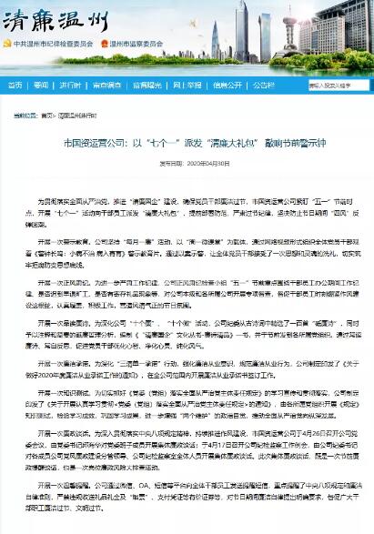 清廉溫州刊發(fā)《市國(guó)資運(yùn)營(yíng)公司:以“七個(gè)一”派發(fā)“清廉大禮包” 敲響節(jié)前警示鐘》全文如下: 為貫徹落實(shí)全面從嚴(yán)治黨,推進(jìn)“清廉國(guó)企”建設(shè),確保黨員干部廉潔過(guò)節(jié),市國(guó)資運(yùn)營(yíng)公司緊盯“五一”節(jié)前時(shí)點(diǎn),開(kāi)展“七個(gè)一”活動(dòng)向干部員工派發(fā)“清廉大禮包”,提前部署防范,嚴(yán)肅過(guò)節(jié)紀(jì)律,堅(jiān)決防止節(jié)日期間“四風(fēng)”反彈回潮。 一是開(kāi)...
