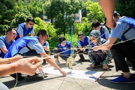拓展活動中,整個團(tuán)隊分成了四支隊伍進(jìn)行比拼。每支隊伍都設(shè)立了隊長,并各自命名為“金牛隊”、“擔(dān)保隊”、“火箭隊”、“財金隊”,同時創(chuàng)建了隊標(biāo)和口號及隊型進(jìn)行團(tuán)隊展示,陸續(xù)開展了飛檐走壁、混合橋、飛奪瀘定橋、懸空搖擺、高空滑索等十三項團(tuán)隊拓展項目。