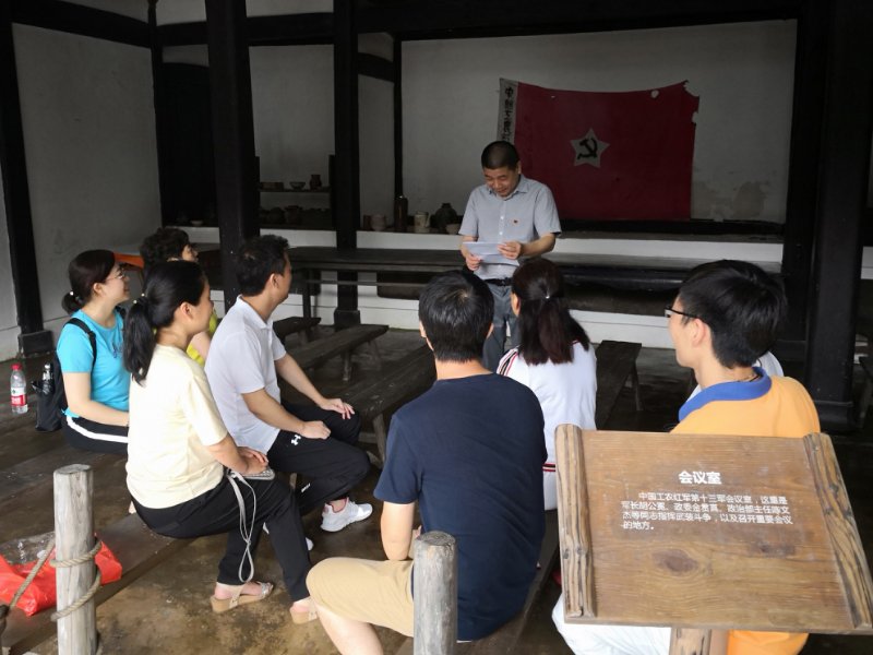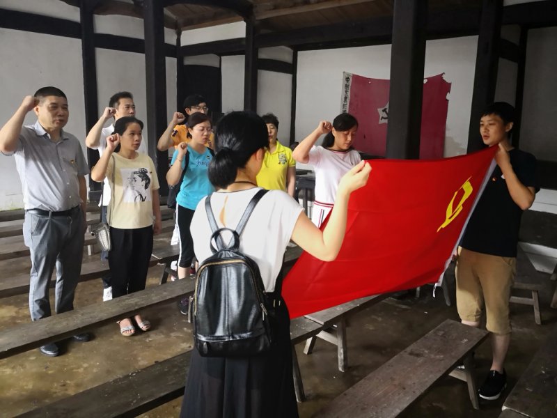 在紅十三軍軍部舊址會(huì)議室,全體黨員在黨旗下重溫入黨誓詞。支部為六、七月份入黨的白榮貴、晏雪松兩位同志過政治生日,發(fā)放生日賀卡。