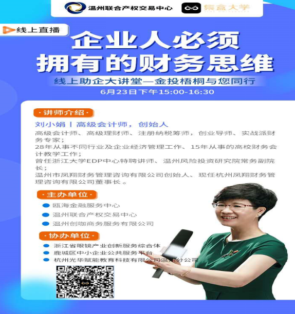 本次活動邀請有15年高校財務會計教學經(jīng)驗、曾任浙江大學EDP中心特聘講師、溫州風險投資研究院常務副院長、溫州市鳳翔財務管理咨詢有限公司創(chuàng)始人劉小娟老師作為嘉賓,通過線上直播的形式,為溫州地區(qū)數(shù)百家企業(yè)講授以《企業(yè)人必須擁有的財務思維》為主題的課程。