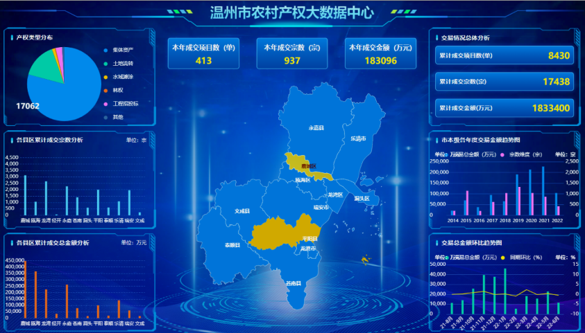 2022年,中心產(chǎn)權(quán)交易金額再創(chuàng)新高,實(shí)現(xiàn)穩(wěn)步向好發(fā)展。完成國(guó)有產(chǎn)權(quán)交易318宗,交易總金額13.07億元,平均增值率8.2%,有效實(shí)現(xiàn)了國(guó)有資產(chǎn)保值增值;完成市級(jí)農(nóng)村產(chǎn)權(quán)交易988宗,交易總金額20.21億元,交易愈發(fā)活躍;走訪(fǎng)對(duì)接企業(yè)、機(jī)構(gòu)461次,深度培育企業(yè)30家,成功撮合間接融資3500萬(wàn)元,助推溫州多層次資本市場(chǎng)高質(zhì)量發(fā)展。
