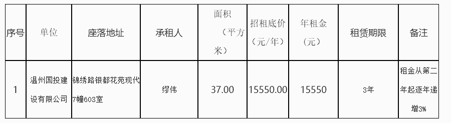 溫州市國(guó)資運(yùn)營(yíng)公司下屬溫州國(guó)投建設(shè)有限公司關(guān)于銀都花苑現(xiàn)代7幢603室房產(chǎn)租賃結(jié)果公示
