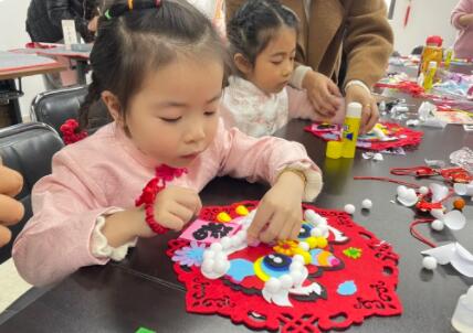 親子間親密合作,一步步按照順序制作掛飾,不一會兒,一只只活潑可愛的“醒獅送?!本统霈F(xiàn)在孩子們面前,看著自己的杰作,孩子們興奮不已。