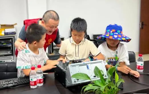 課堂上,來自溫州國投資源回收科技有限公司黨支部的黨員為孩子們介紹計算機(jī)的歷史以及原理,帶領(lǐng)孩子們了解“計算機(jī)”機(jī)箱里的秘密,手把手教孩子們對計算機(jī)主機(jī)進(jìn)行拆解,直觀認(rèn)識主機(jī)內(nèi)部構(gòu)造,看著自己親手組裝的電腦能正常開機(jī),孩子們激動萬分。