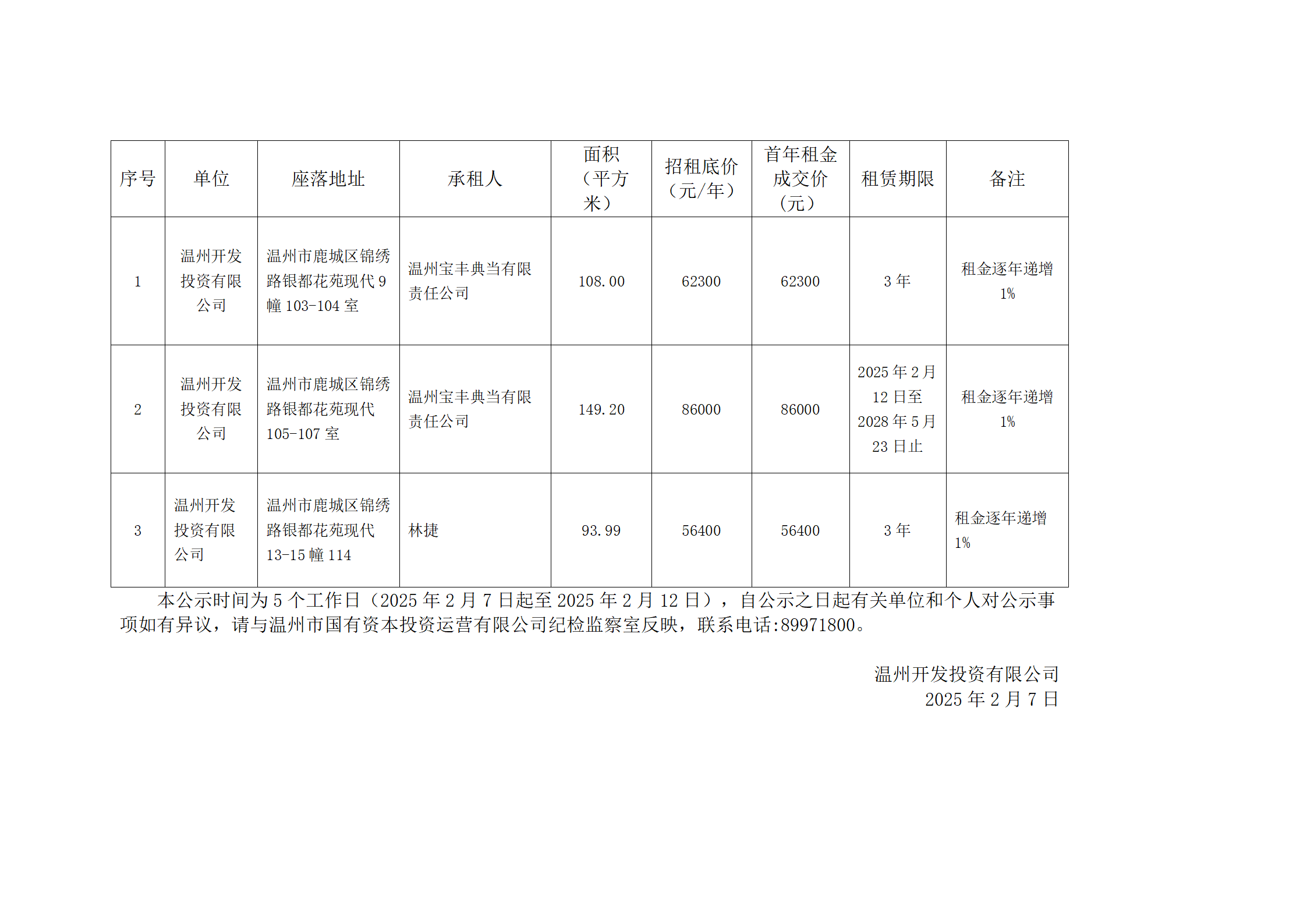 溫州市國有資本投資運(yùn)營有限公司下屬溫州開發(fā)投資有限公司關(guān)于溫州市鹿城區(qū)錦繡路銀都花苑9幢103-104室等房產(chǎn)招租結(jié)果公示