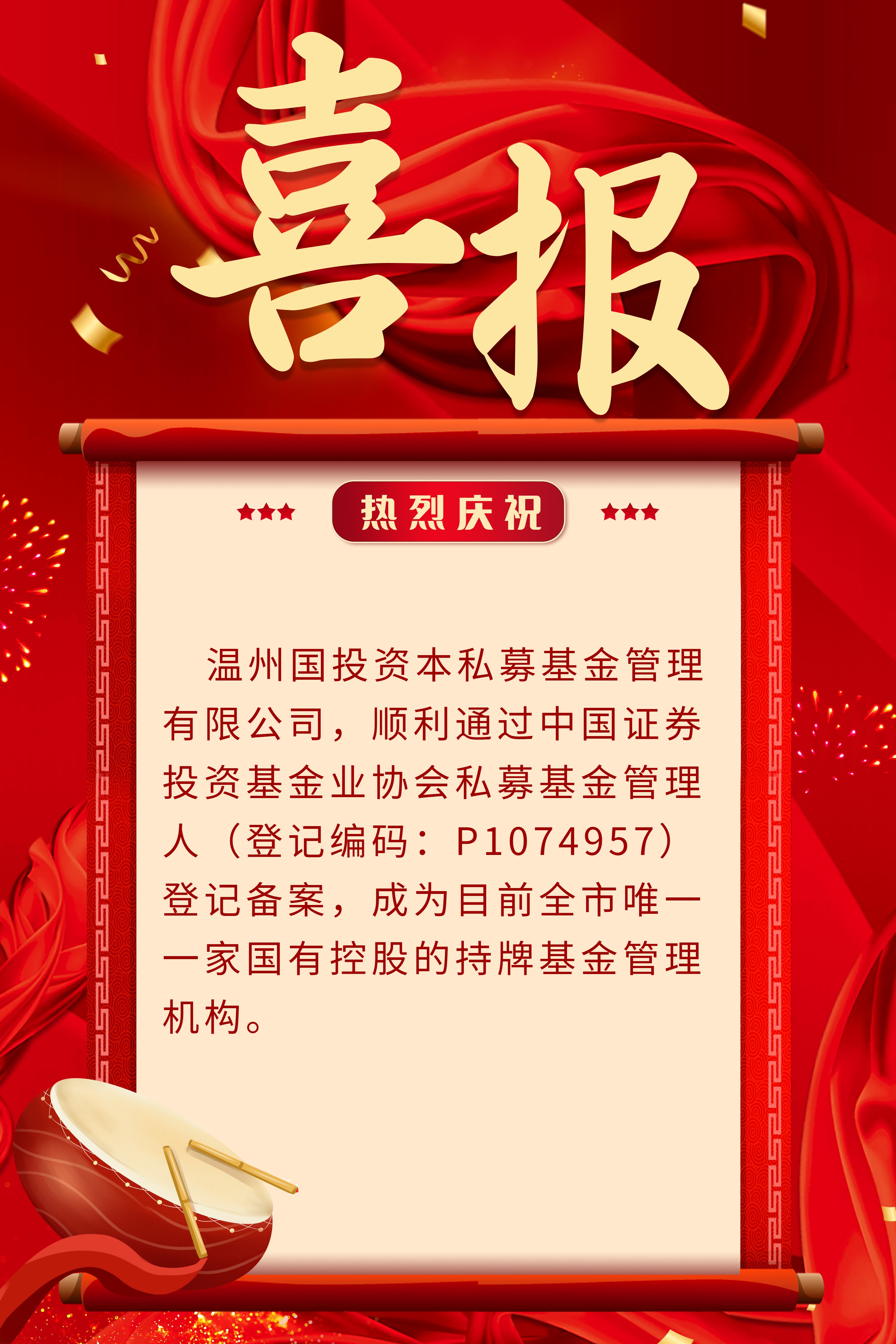 3月31日,在市委、市政府的堅強領導下,在市政府辦公室、市國資委等相關部門的大力支持下,溫州市國有資本投資運營有限公司旗下溫州國投資本私募基金管理有限公司,順利通過中國證券投資基金業(yè)協會私募基金管理人(登記編碼:P1074957)登記備案,成為目前全市唯一一家國有控股的持牌基金管理機構,標志著溫州國資在私募基金投資業(yè)務牌照上實現了零的突破,為市屬國資國企改革和“大國投”平臺打造注入強勁的動能。