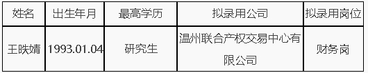 根據(jù)《溫州市國有資本投資運(yùn)營有限公司關(guān)于開展高校應(yīng)屆畢業(yè)生校園招聘的公告》、《溫州市國有資本投資運(yùn)營有限公司高校應(yīng)屆畢業(yè)生校園招聘放棄及遞補(bǔ)人員名單公布》,并按程序體檢、考察,經(jīng)公司黨委研究,王昳婧為溫州聯(lián)合產(chǎn)權(quán)交易中心有限公司財(cái)務(wù)崗擬錄用人選,具體公示如下: