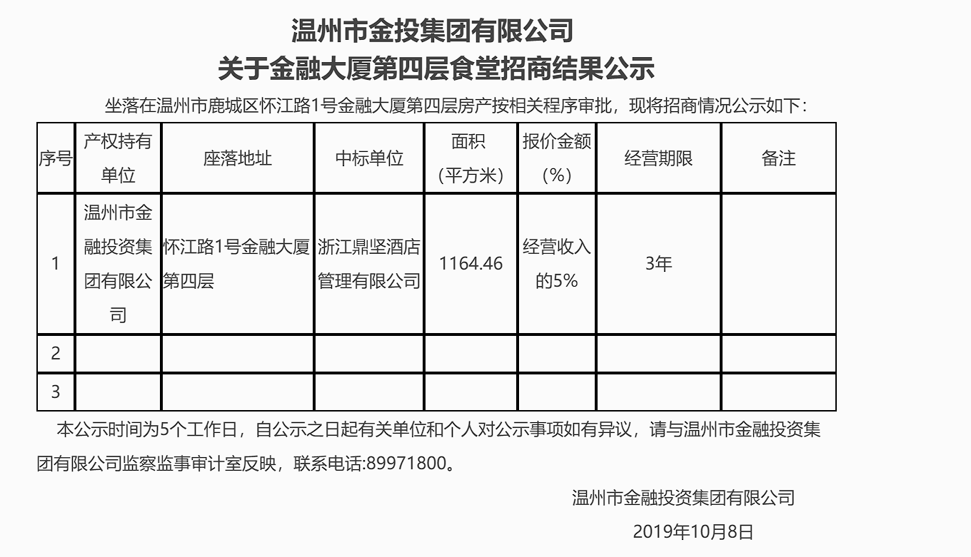 溫州市金投集團(tuán)有限公司關(guān)于金融大廈第四層食堂招商結(jié)果公示